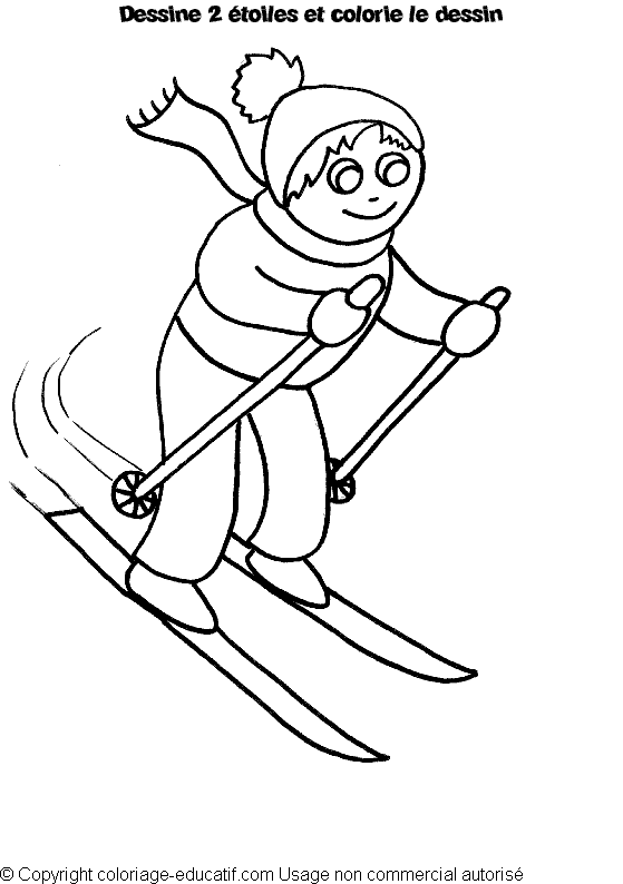 ![]() L’enfant doit dessiner deux étoiles et ensuite colorier la garçon qui ski. Dans cet exercice, il apprend le nombre 2, fait du dessin et du coloriage |