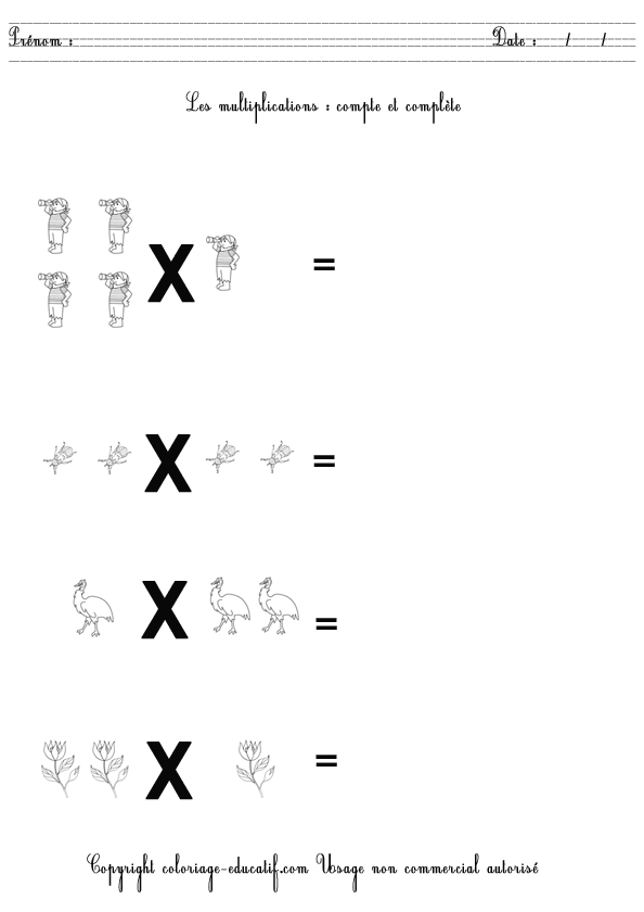 L’enfant doit compter et compléter les multiplications suivantes. Et quand il aura fini, il pourra colorier son dessin.