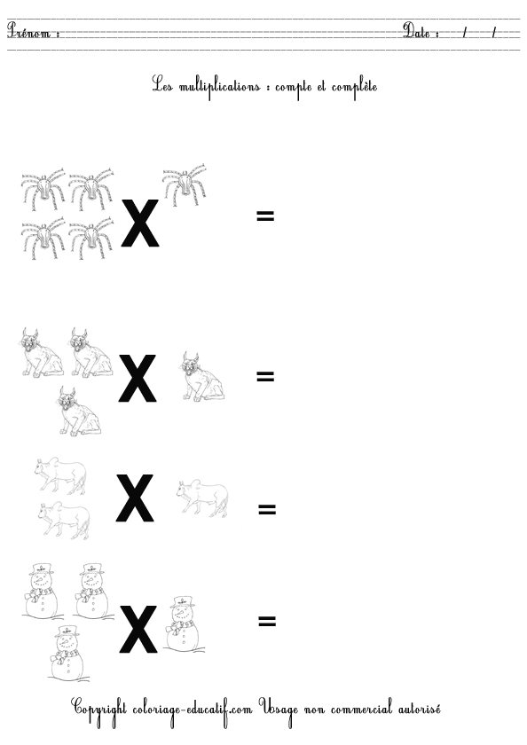 L’enfant doit compter et compléter les multiplications suivantes. Et quand il aura fini, il pourra colorier son dessin.