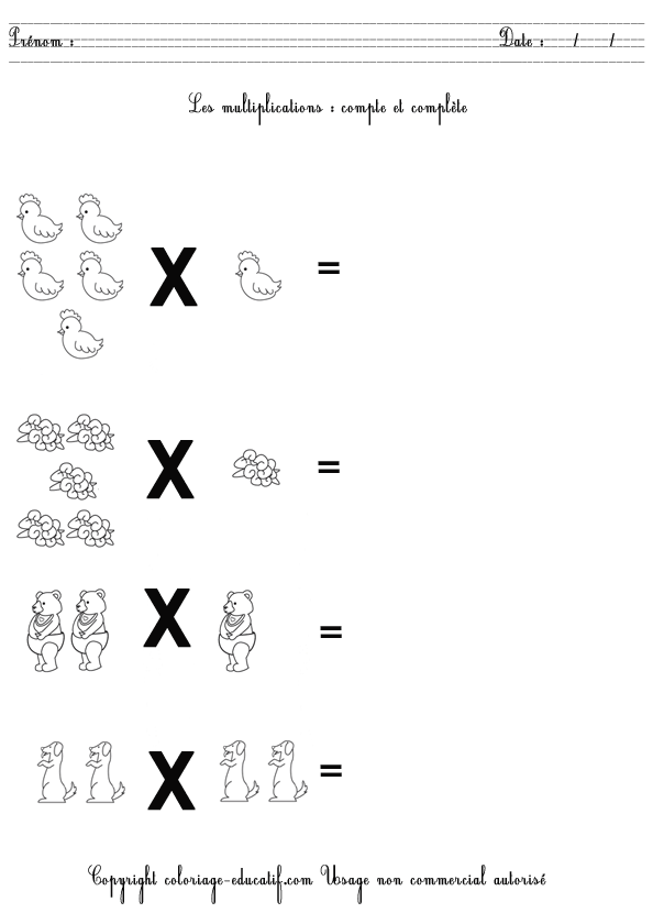 L’enfant doit compter et compléter les multiplications suivantes. Et quand il aura fini, il pourra colorier son dessin.