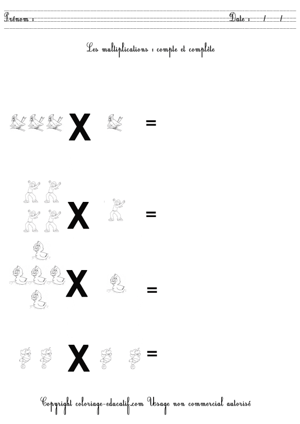 L’enfant doit compter et compléter les multiplications suivantes. Et quand il aura fini, il pourra colorier son dessin.