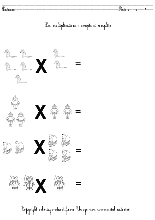L’enfant doit compter et compléter les multiplications suivantes. Et quand il aura fini, il pourra colorier son dessin.