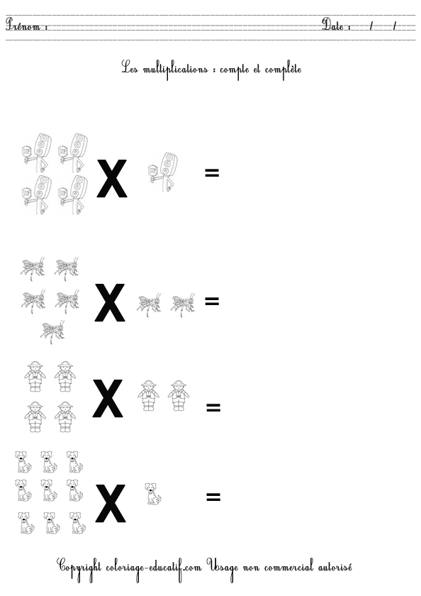 L’enfant doit compter et compléter les multiplications suivantes. Et quand il aura fini, il pourra colorier son dessin.