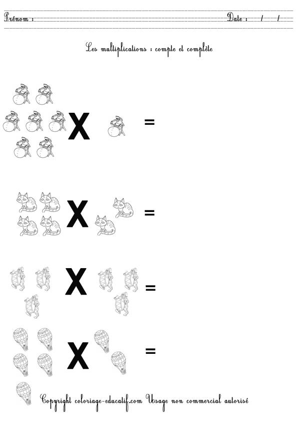 L’enfant doit compter et compléter les multiplications suivantes. Et quand il aura fini, il pourra colorier son dessin.
