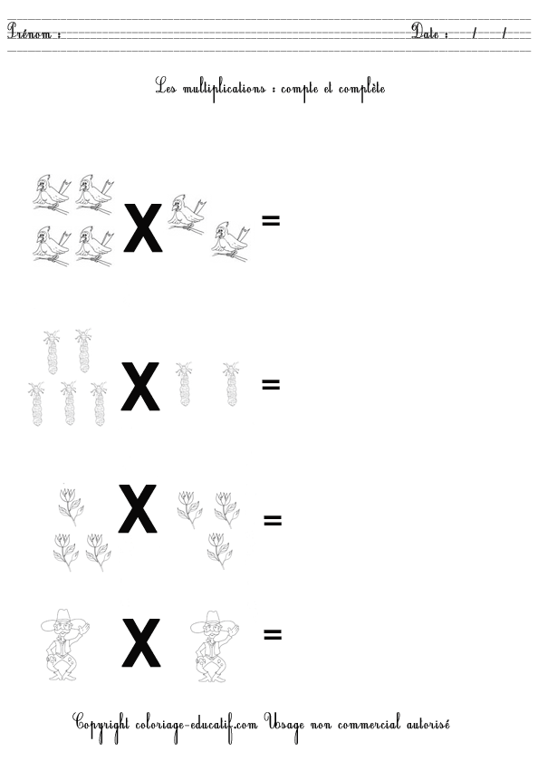 L’enfant doit compter et compléter les multiplications suivantes. Et quand il aura fini, il pourra colorier son dessin.