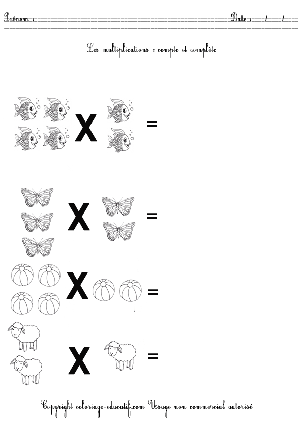 L’enfant doit compter et compléter les multiplications suivantes. Et quand il aura fini, il pourra colorier son dessin.