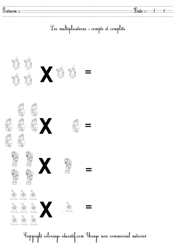 L’enfant doit compter et compléter les multiplications suivantes. Et quand il aura fini, il pourra colorier son dessin.