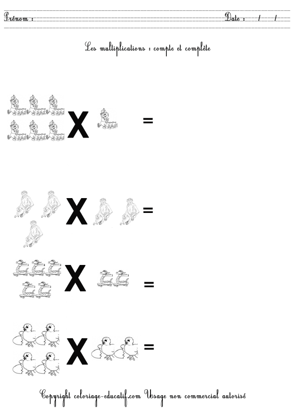L’enfant doit compter et compléter les multiplications suivantes. Et quand il aura fini, il pourra colorier son dessin.
