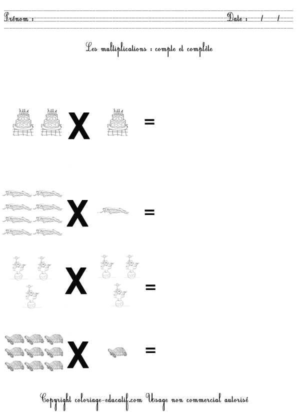L’enfant doit compter et compléter les multiplications suivantes. Et quand il aura fini, il pourra colorier son dessin.