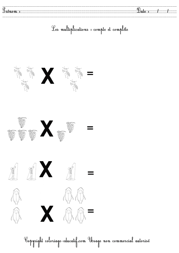 L’enfant doit compter et compléter les multiplications suivantes. Et quand il aura fini, il pourra colorier son dessin.