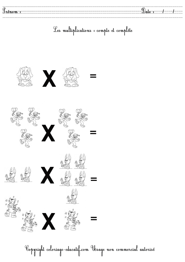 L’enfant doit compter et compléter les multiplications suivantes. Et quand il aura fini, il pourra colorier son dessin.
