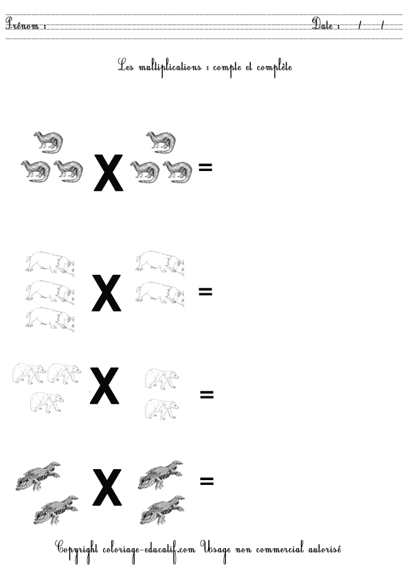L’enfant doit compter et compléter les multiplications suivantes. Et quand il aura fini, il pourra colorier son dessin.