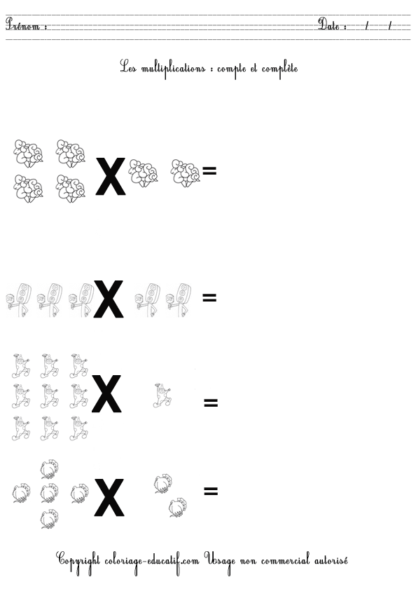L’enfant doit compter et compléter les multiplications suivantes. Et quand il aura fini, il pourra colorier son dessin.