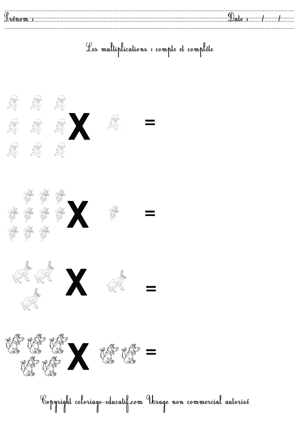 L’enfant doit compter et compléter les multiplications suivantes. Et quand il aura fini, il pourra colorier son dessin.