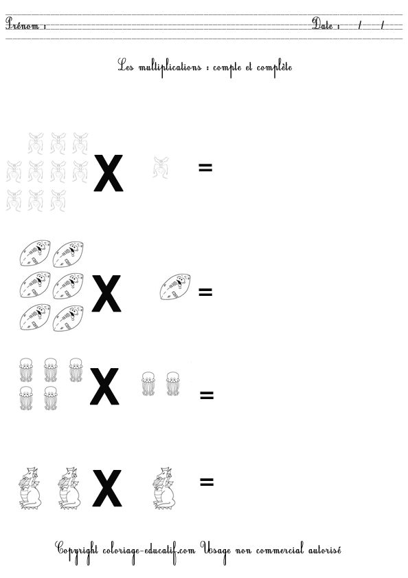 L’enfant doit compter et compléter les multiplications suivantes. Et quand il aura fini, il pourra colorier son dessin.