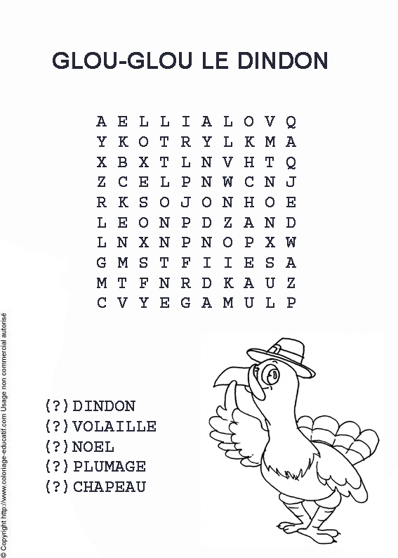 ![]() Retrouve les mots cachés dans la grille et colorie ! dindon volaille noel plumage chapeau |