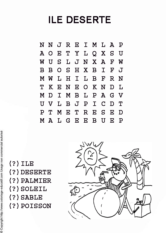 ![]() Retrouve les mots cachés dans la grille et colorie ! ile déserte palmier soleil sable poisson |