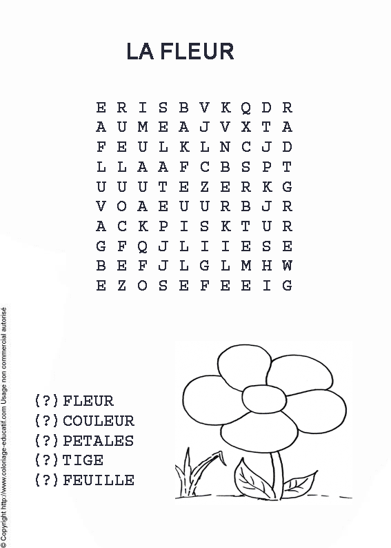 ![]() Retrouve les mots cachés dans la grille et colorie ! fleur couleur pétales tige feuilles |