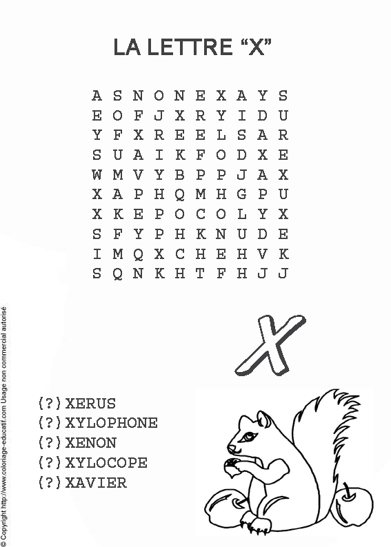![]() Retrouve les mots cachés dans la grille et colorie ! xerus xylophone xenon xylocope xavier |