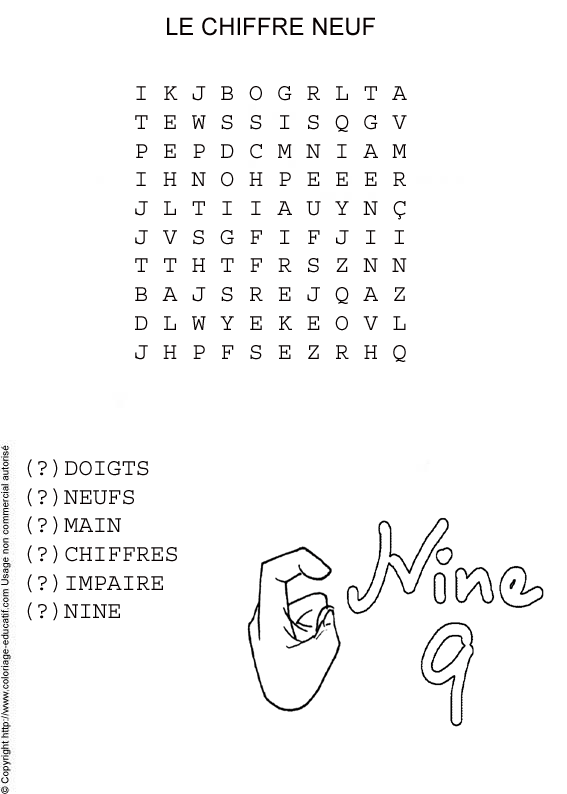 ![]() Retrouve les mots cachés dans la grille et colorie ! doigts neuf main chiffre impaire nine |