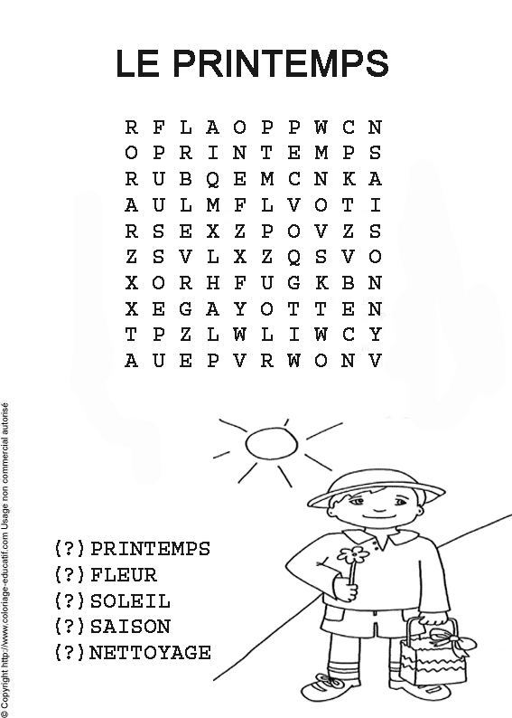 ![]() Retrouve les mots cachés dans la grille et colorie ! printemps fleur soleil saison nettoyage |