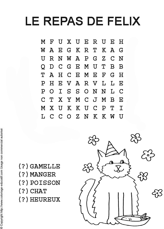 ![]() Retrouve les mots cachés dans la grille et colorie ! gamelle manger poisson chat heureux |