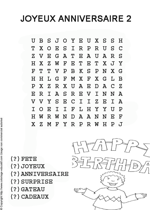 ![]() Retrouve les mots cachés dans la grille et colorie ! fete joyeux anniversaire surpris gateau cadeaux |