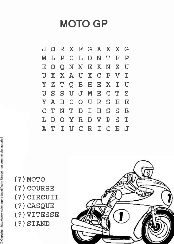 ![]() Retrouve les mots cachés dans la grille et colorie ! moto course circuit casque vitesse stand |