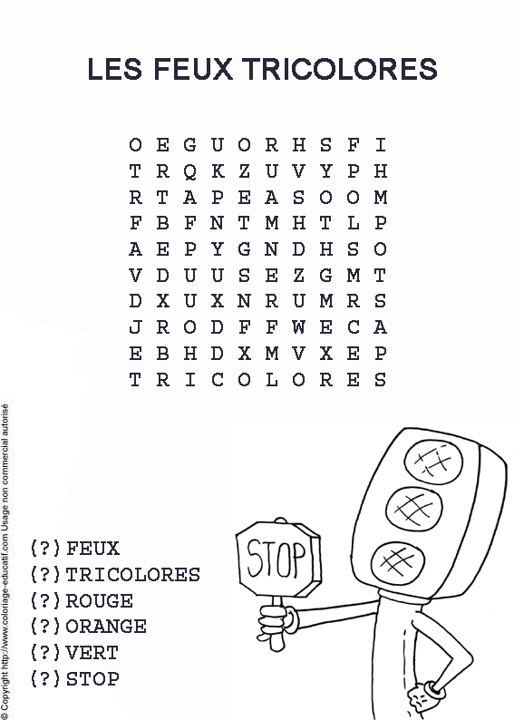 ![]() Retrouve les mots cachés dans la grille et colorie ! feux tricolores rouge orange vert stop |