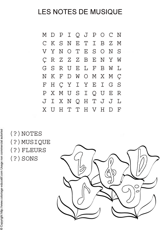 ![]() Retrouve les mots cachés dans la grille et colorie ! notes musique fleurs sons |