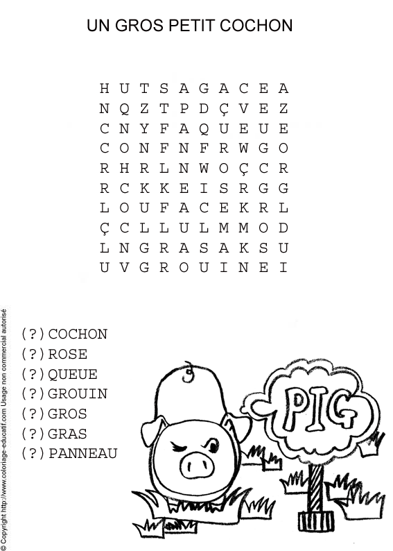 ![]() Retrouve les mots cachés dans la grille et colorie ! cochon rose queue grouin gros gras panneau |