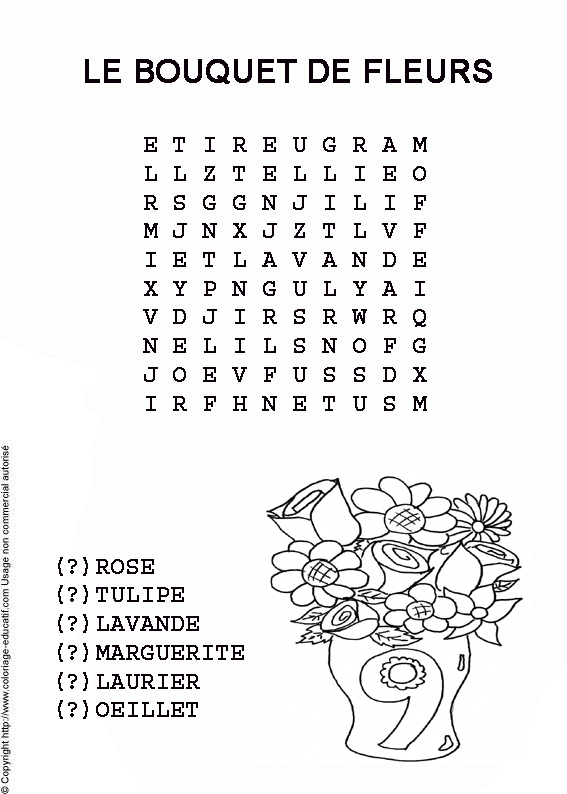![]() Retrouve les mots cachés dans la grille et colorie ! rose tulipe lavande marguerite laurier oeillet |