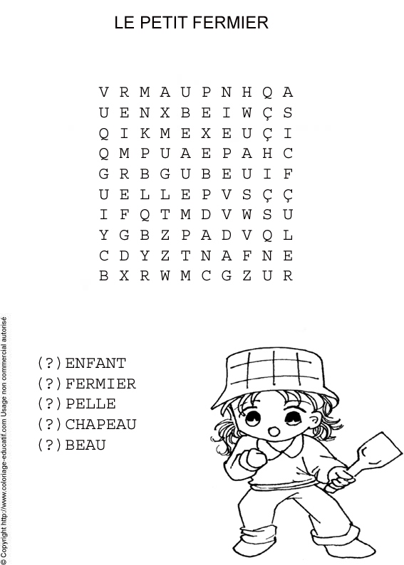 ![]() Retrouve les mots cachés dans la grille et colorie ! enfant fermier pelle travailleur chapeau |