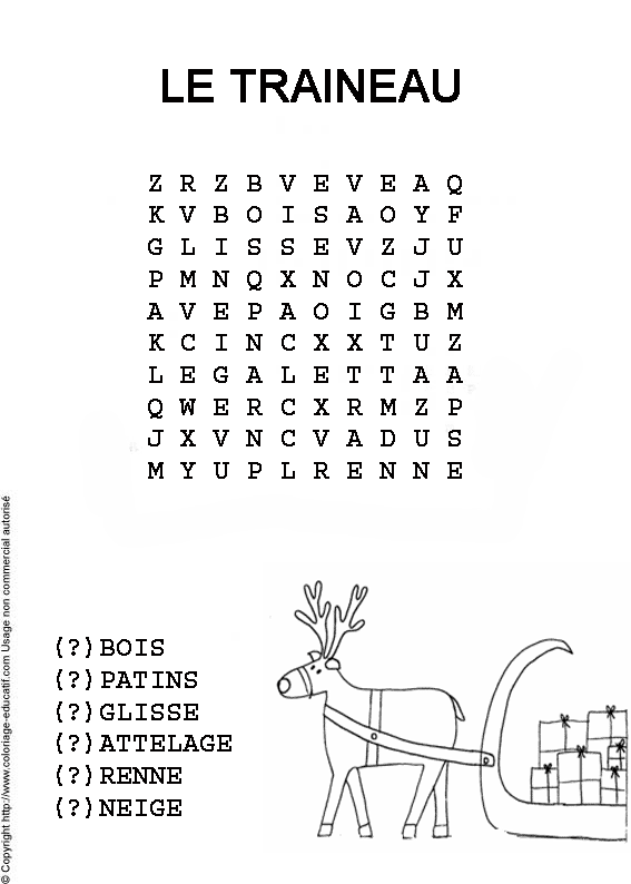 ![]() Retrouve les mots cachés dans la grille et colorie ! bois patins glisse atelage renne neige |