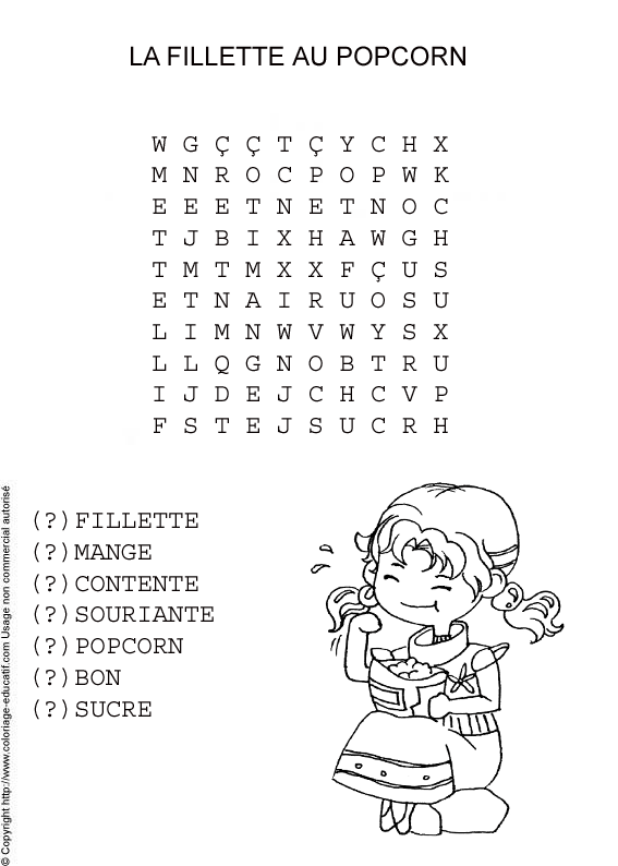 ![]() Retrouve les mots cachés dans la grille et colorie ! fillette mange contente souriante popcorn bon sucré |