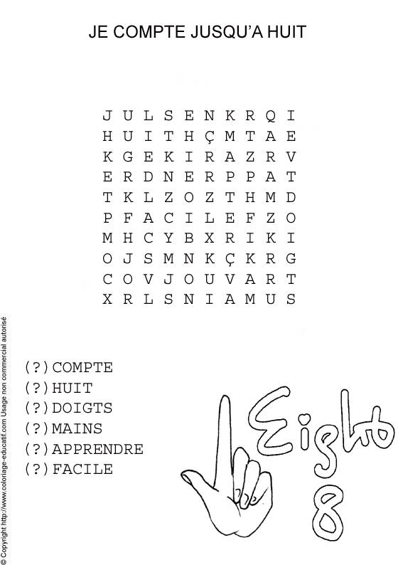 ![]() Retrouve les mots cachés dans la grille et colorie ! compte huit doigts mains apprendre facile |