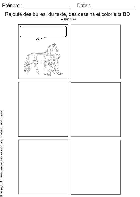 ![]() Qu'arrive-t-il au cheval et son dresseur ? A toi de trouver la suite en complétant les cinq cases. L'enfant devra rajouter les images, les bulles et les textes qui manquent afin de compléter la petite histoire. |