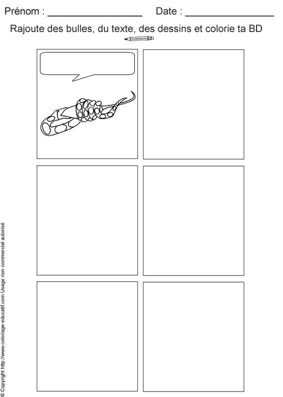 ![]() Qu'arrive-t-il au serpent qui mange sa proie ? A toi de trouver la suite en complétant les cinq cases. L'enfant devra rajouter les images, les bulles et les textes qui manquent afin de compléter la petite histoire. |