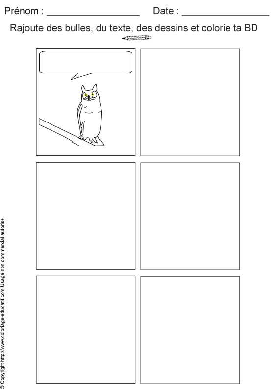 ![]() Qu'arrive-t-il à la chouette ? A toi de trouver la suite en complétant les cinq cases. L'enfant devra rajouter les images, les bulles et les textes qui manquent afin de compléter la petite histoire. |