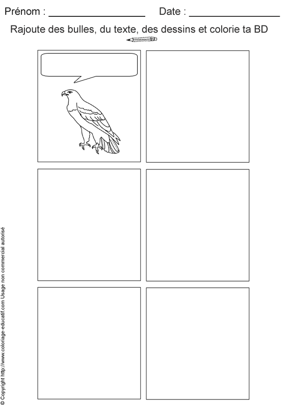 ![]() Qu'arrive-t-il à cet aigle ? A toi de trouver la suite en complétant les cinq cases. L'enfant devra rajouter les images, les bulles et les textes qui manquent afin de compléter la petite histoire. |