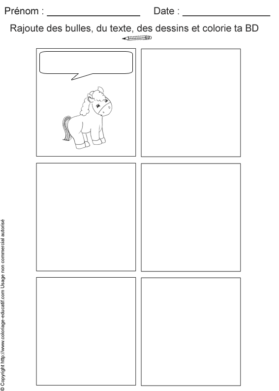 ![]() Qu'arrive-t-il au petit cheval ? A toi de trouver la suite en complétant les cinq cases. L'enfant devra rajouter les images, les bulles et les textes qui manquent afin de compléter la petite histoire. |