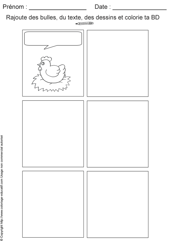 ![]() Qu'arrive-t-il à la poule dans son nid ? A toi de trouver la suite en complétant les cinq cases. L'enfant devra rajouter les images, les bulles et les textes qui manquent afin de compléter la petite histoire. |