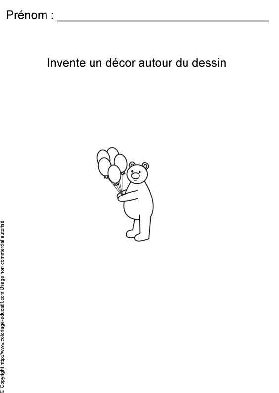 ![]() L'enfant doit imaginer un décor autour de l'ours et ses ballons et ensuite colorier son dessin. |