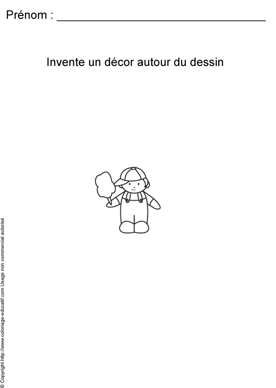 L'enfant doit imaginer un décor autour du garçon qui mange sa barbe à papa et ensuite colorier son dessin.
