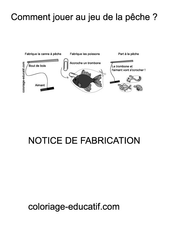![]() La notice de fabrication du jeu sur la pêche : Prendre des aimants, bâtons en bois, ficelle, crayons, ciseaux |